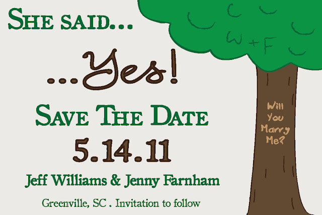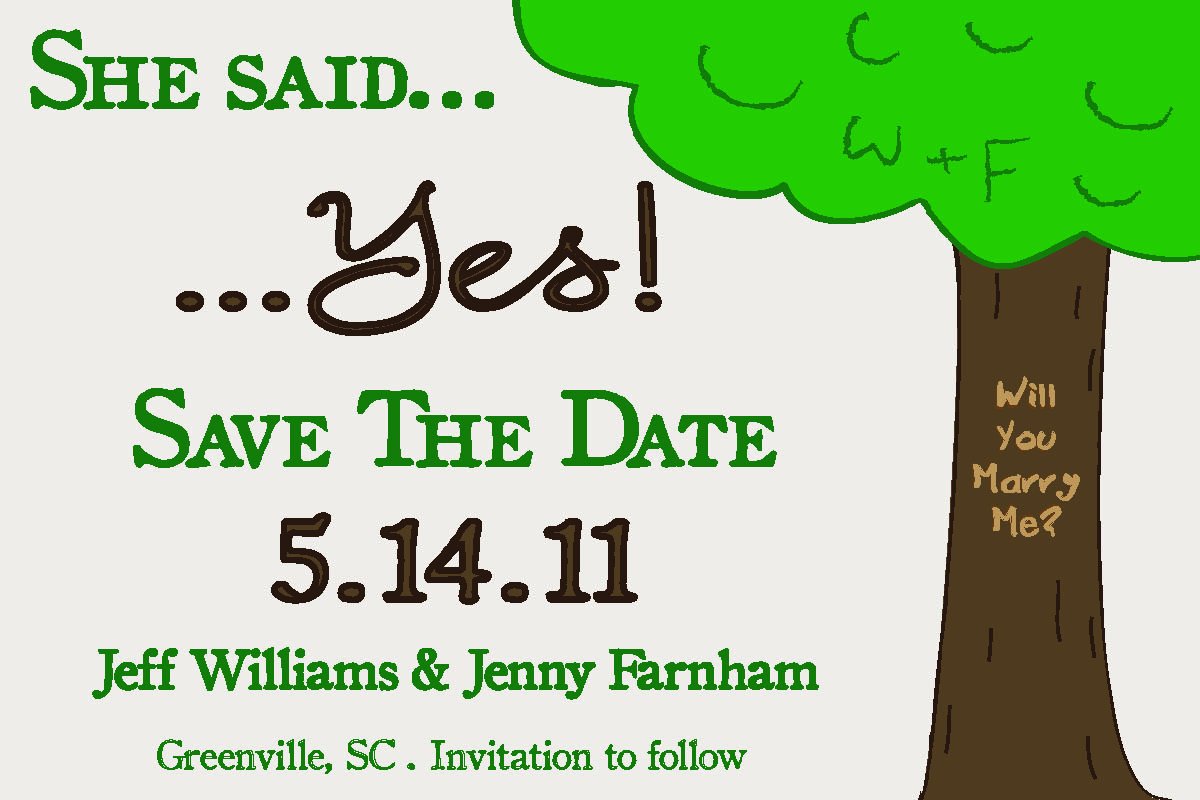 BUT I just didn’t like everything about that one either. Jeff gave me an amazing proposal experience. Long, wonderful, romantic story made short…We had spent the day with my family and then went hiking at Raven Cliff Falls. At the top of the trail he had “Will You Marry Me?” carved in a tree!! I wanted to work on “drawing” objects in Adobe Illustrator so I decided to make a FUN save the date that reflected how our journey to May 14th began.